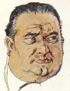 Mass of dark brown hair, very little greying, is not parted but sweeps off to the right because he brushes with his right hand. Dark brown eyes are average in size, but look smaller because they are mostly half closed. They always are aimed straight at the person he is talking to. Forehead is high. Head and face are big but do not seem so in proportion to the whole. Ears rather small. Nose long and narrow, slightly aquiline. Mouth mobile and extremely variable; lips when pursed are full and thick, but in tense moments they are thin and their line is long. Cheeks full but not pudgy; the high point of the cheekbone can be seen from straight front. Complexion varies from some floridly after meals to an ivory pallor late at night when he has spent six hard hours working on someone. He breathes smoothly and without sound except when his is eating; then he takes in and lets out great gusts of air. His massive shoulders never slump; when he stands up at all he stands straight. He shaves every day. He has a small brown mole just above his right jawbone, halfway between the chin and the ear.